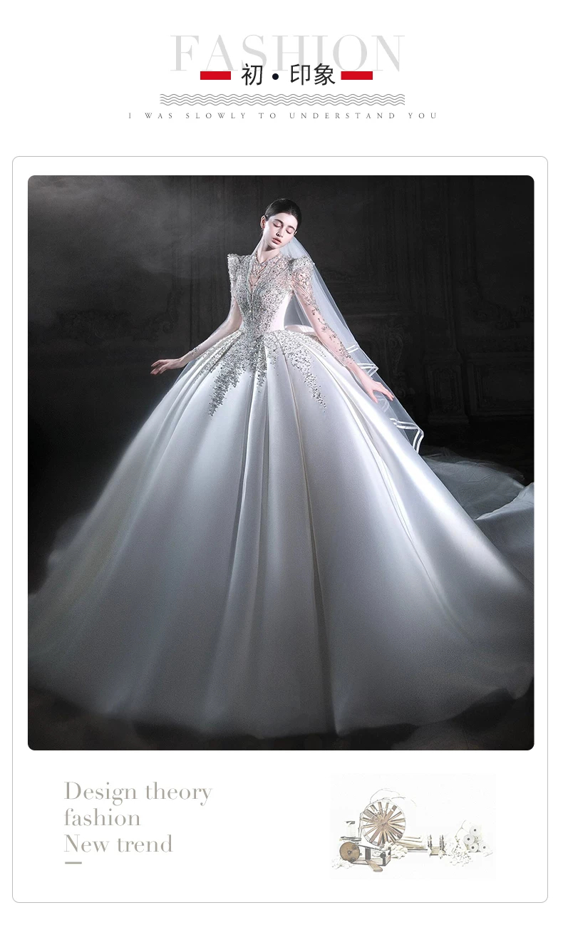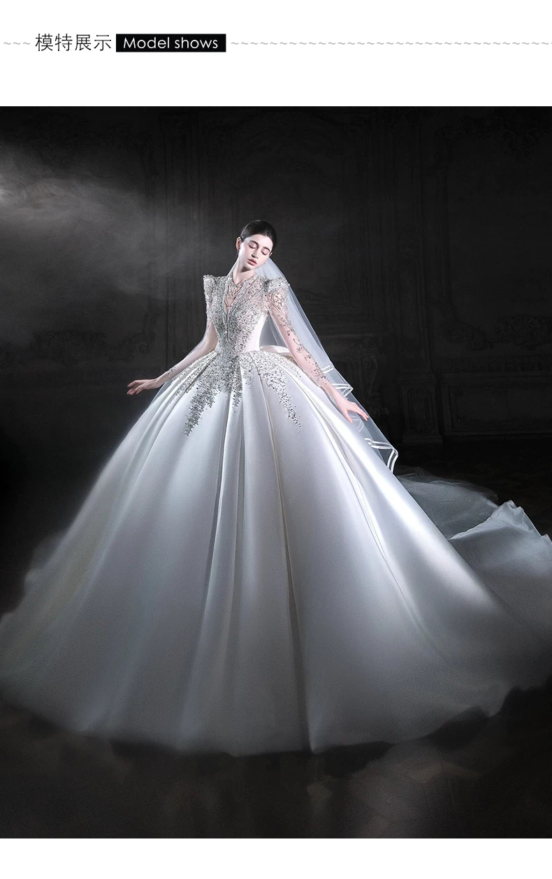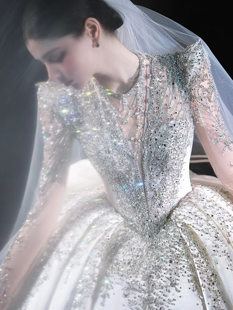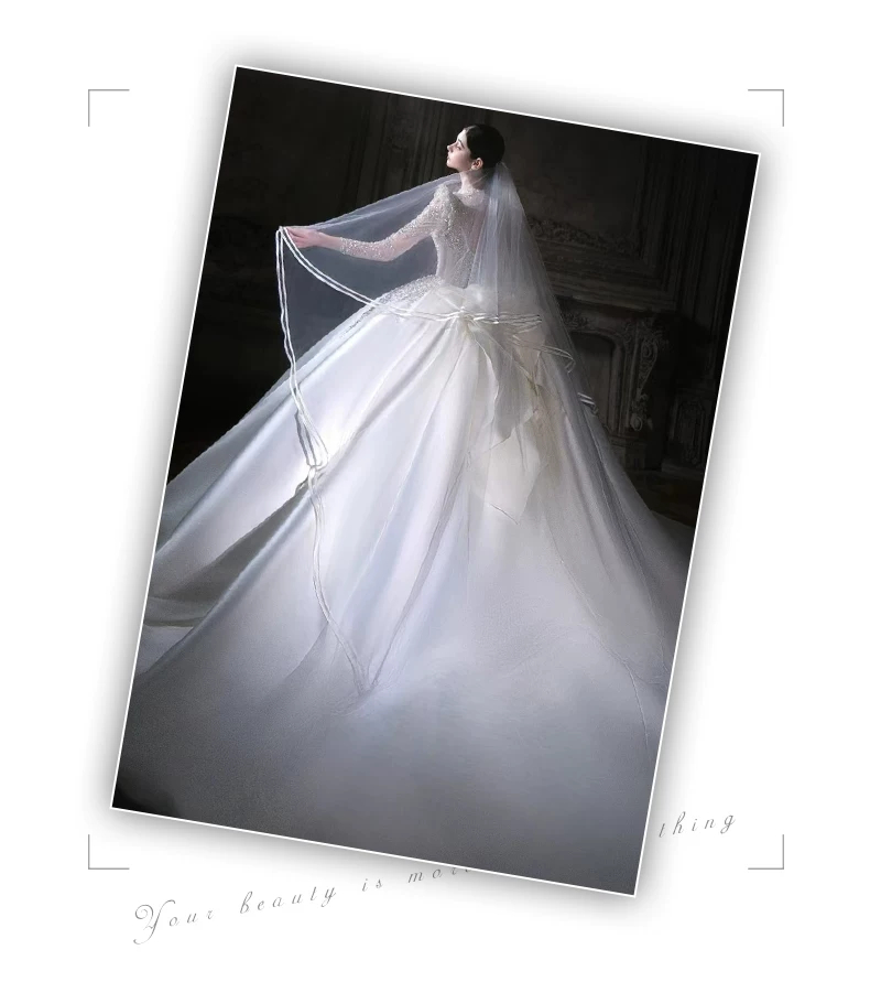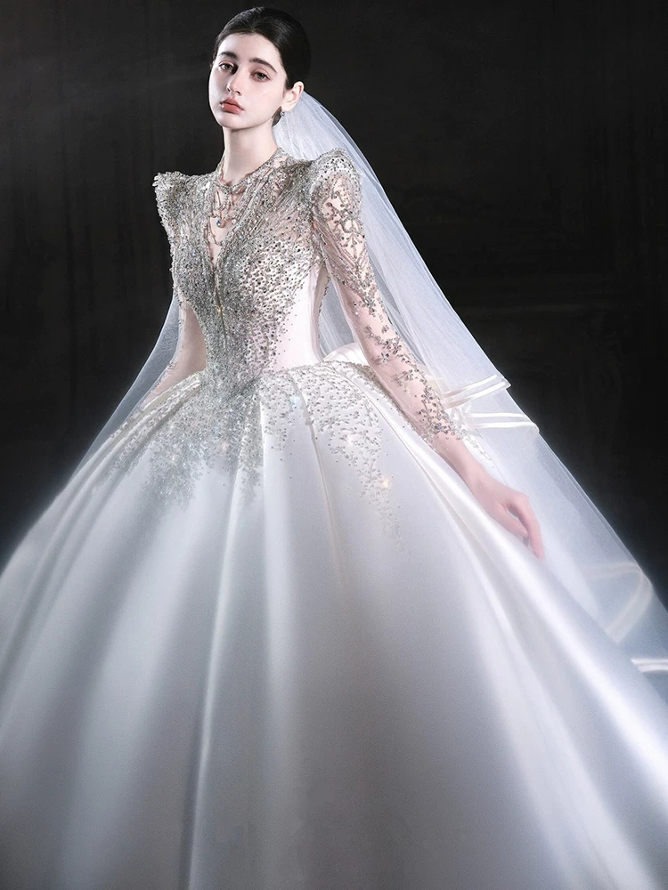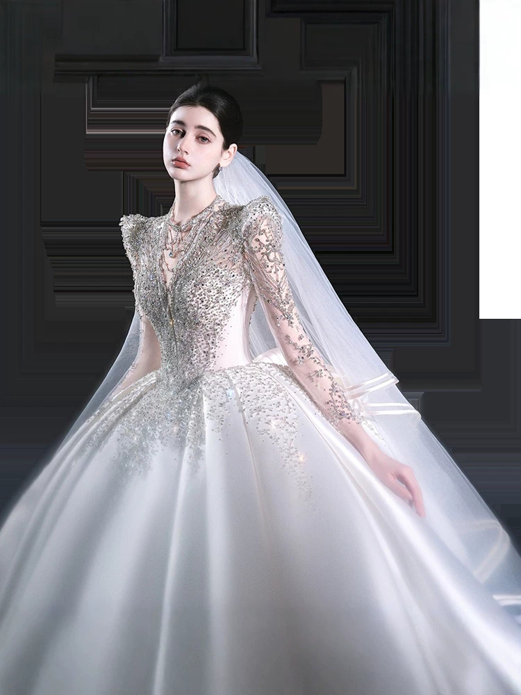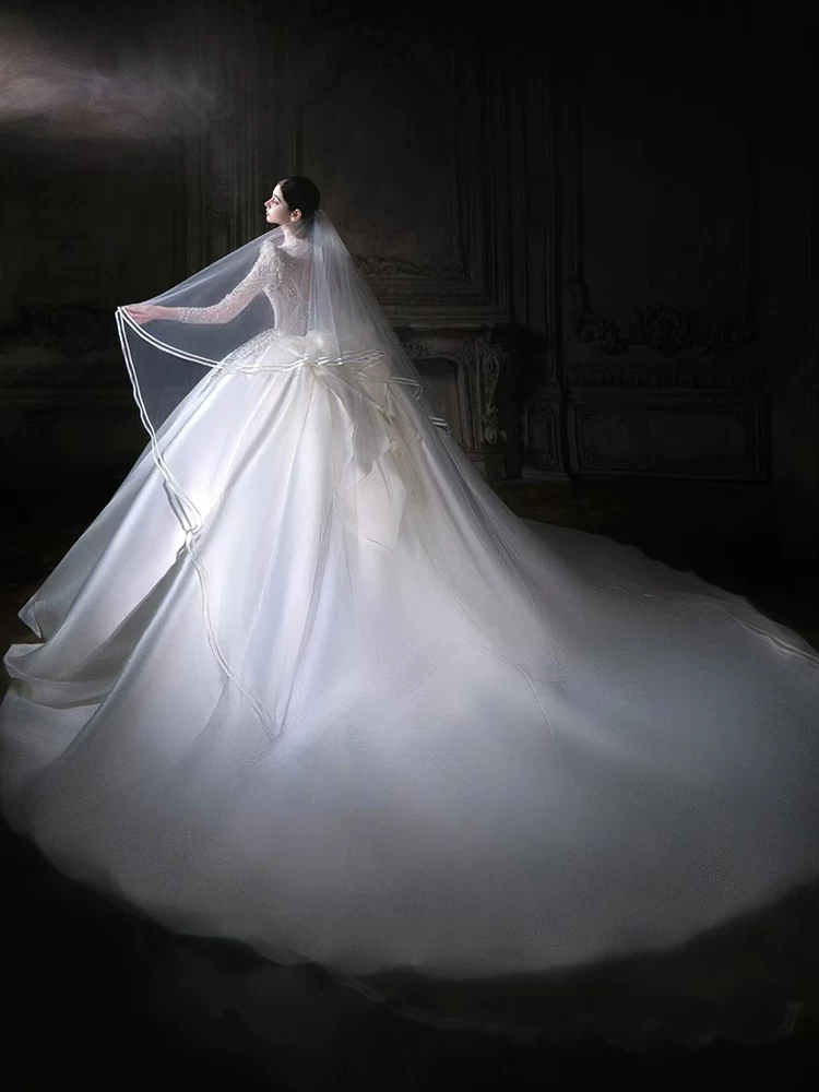 Váy cưới dài tay bằng vải satin kiểu Pháp, kiểu dáng mới năm 2026, váy cưới chính cao cấp màu trắng với đuôi váy dài.