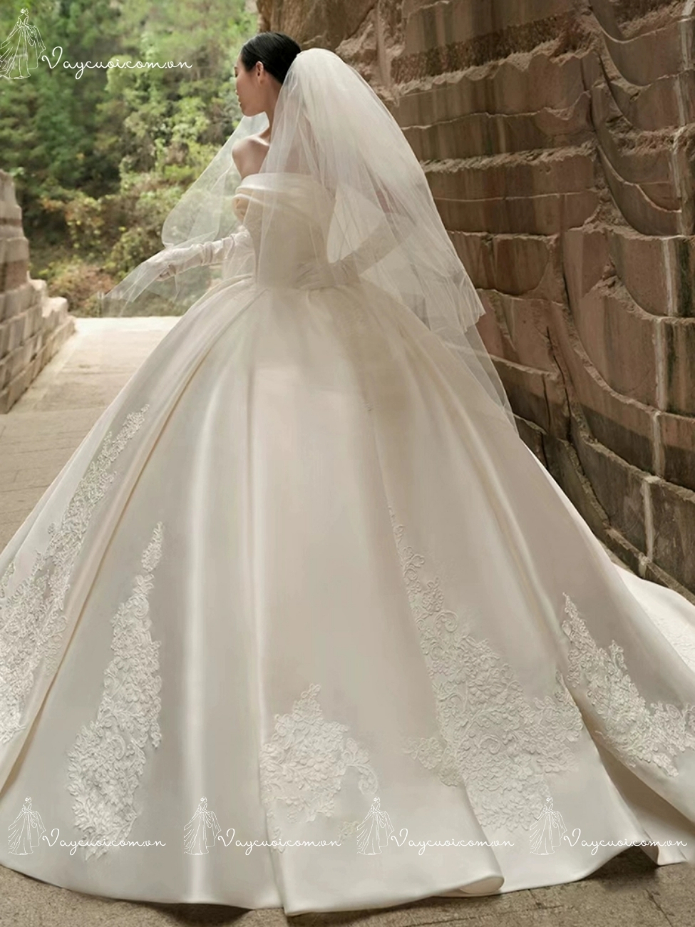 Váy Cưới Satin Đuôi Dài Thêu Ren – Thiết Kế Cạp Cao Tinh Tế VC41