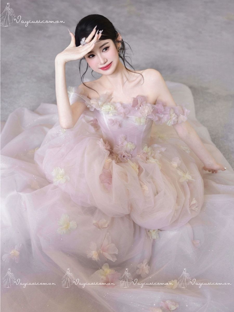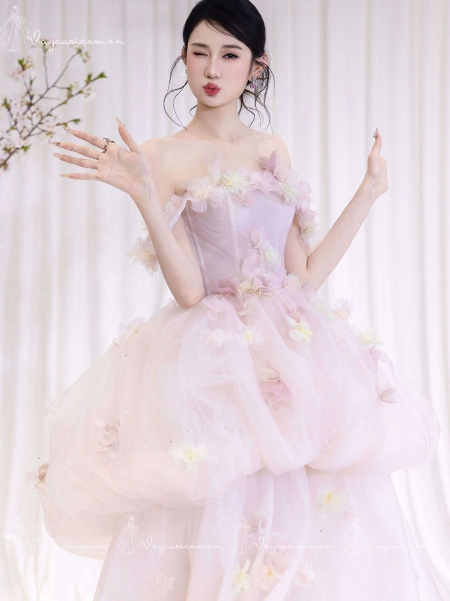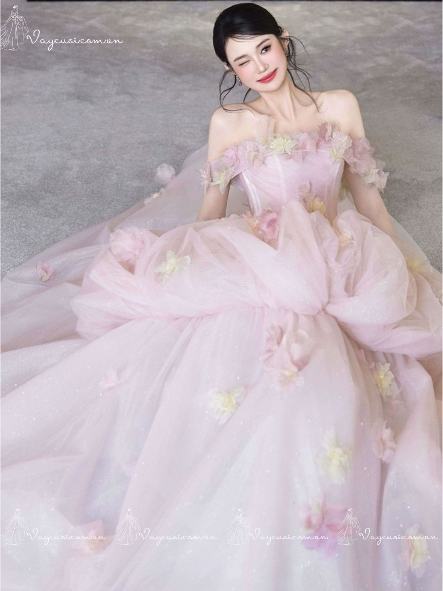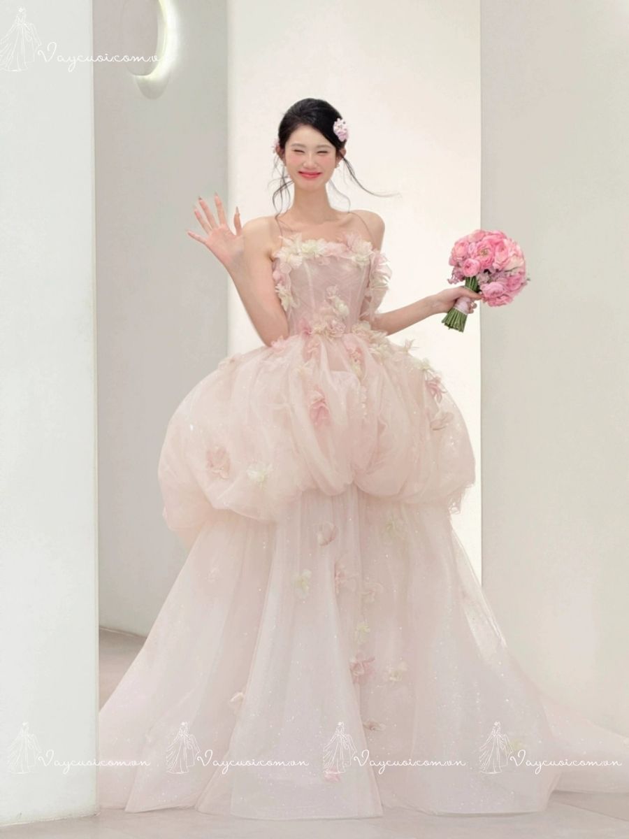 Váy Cưới Nhẹ Nhàng Kiểu Pháp Mẫu Mới: Công Chúa Hồng Đính Hoa 3D – Váy Cưới Nhẹ Nhàng Kiểu Pháp Mẫu Mới